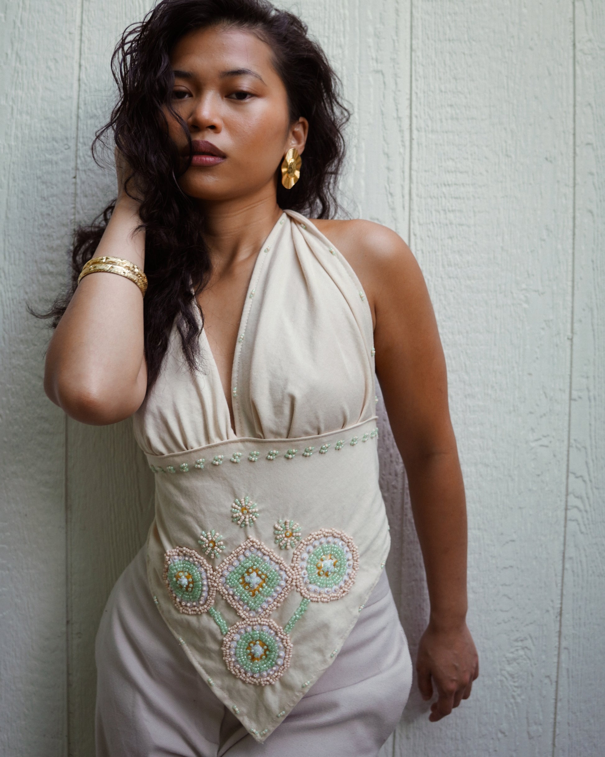The BANAYAD is consciously crafted from 100% cotton for a soft yet structured silhouette. Its design features an intricate panel of hand-embroidered beadwork by Bagobo Tagabawa artisans. Thoughtfully designed and finished in Oakland, California, the BANAYAD top harmonizes indigenous Filipino artistry with contemporary luxury — embodying both legacy and elegance in every stitch.