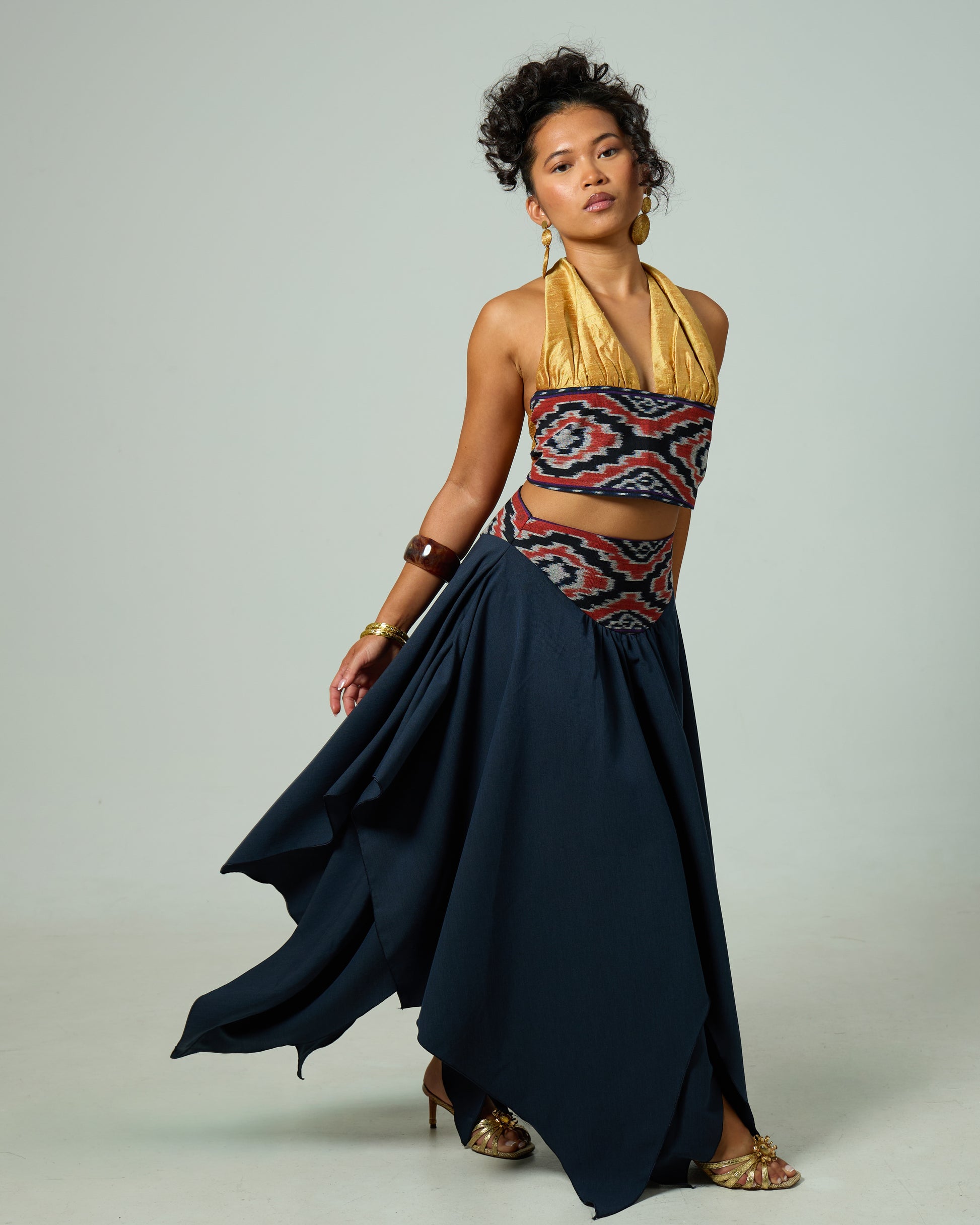 The PAMANA top is crafted from 100% raw silk with an opulent gold luster lined with 100% cotton, complemented by 100% dyed cotton Balud Ikat woven with artisanal precision in Davao, Philippines.