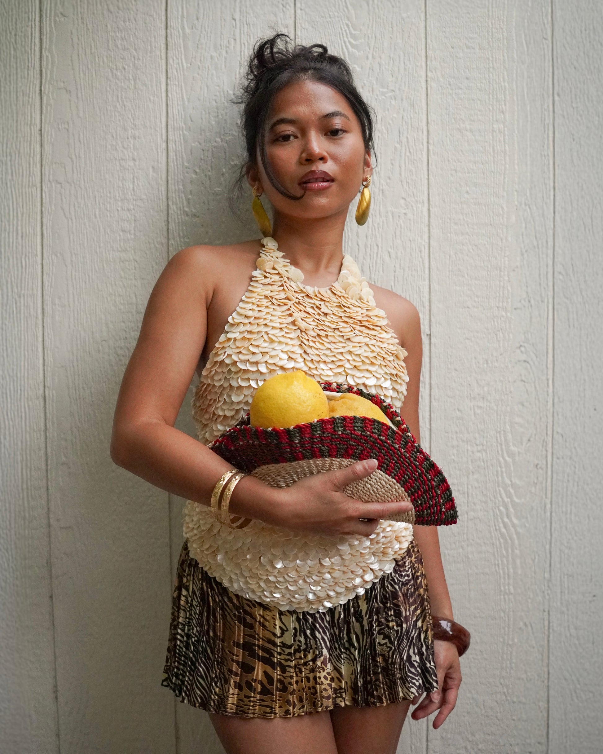 The SINAG top is adorned with over a thousand hand-sewn mother of pearl shells sourced from the waters of Capiz of Panay Island.